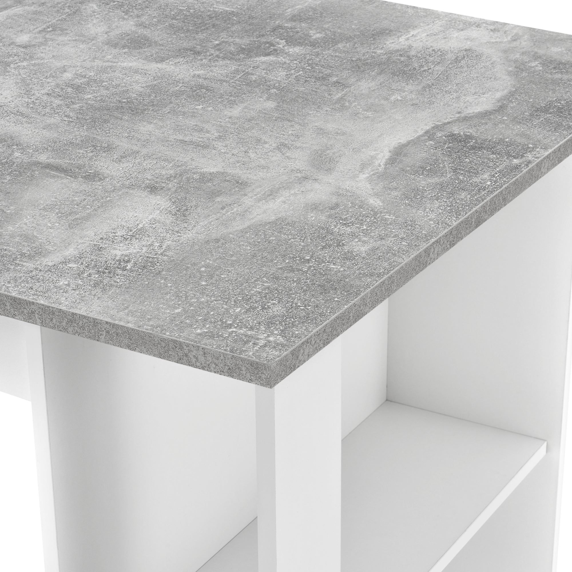 Son large plateau offre suffisamment d’espace pour les repas, les boissons ou les dossiers de travail. Pratique et astucieux, le meuble dispose sur le côté d’une étagère intégrée avec trois compartiments ouverts, parfaits pour ranger verres, bouteilles ou ustensiles de cuisine à portée de main.