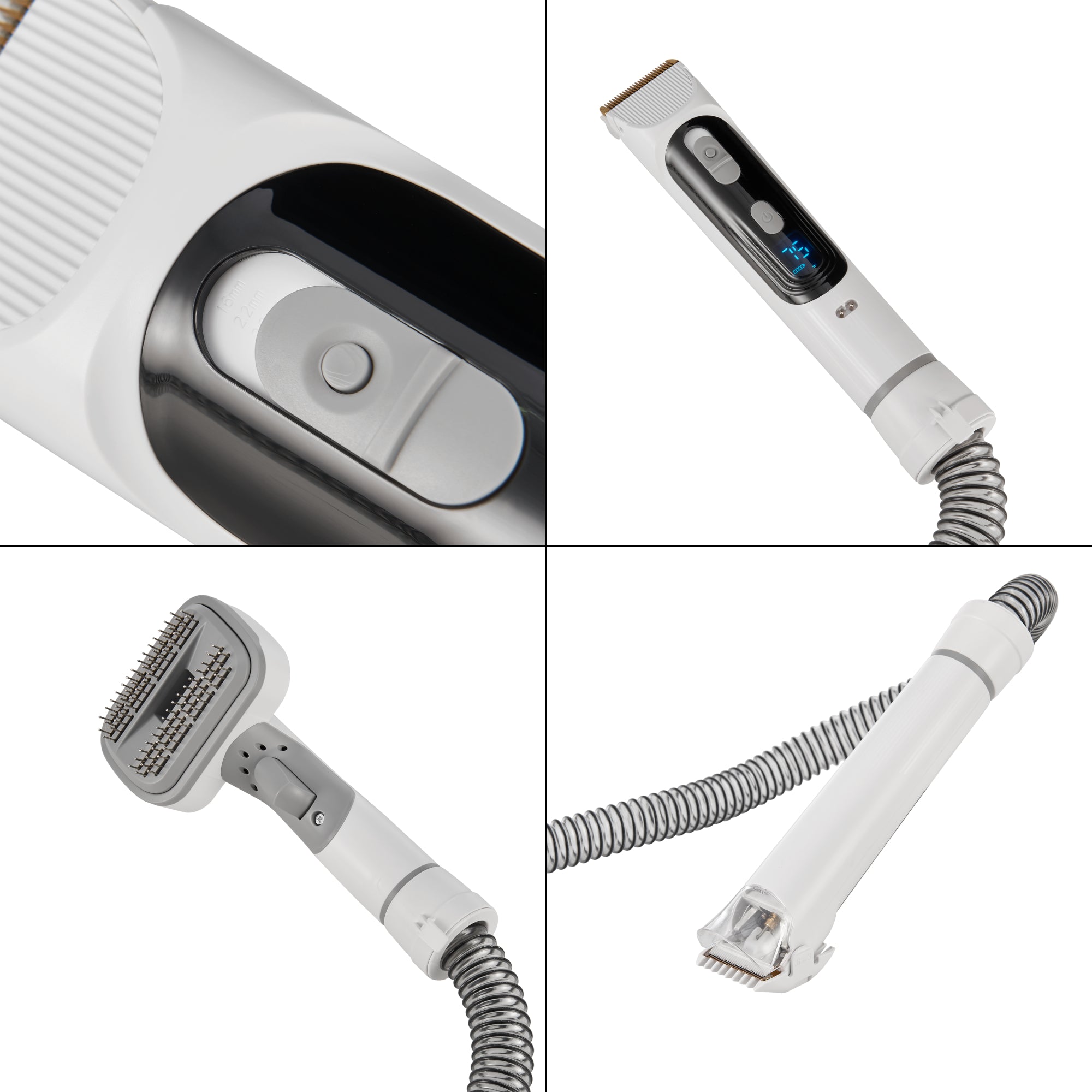 Notre kit de soins 5 en 1 pour animaux comprend une tondeuse électrique avec aspiration, des peignes, des brosses et un embout à fentes. La tondeuse coupe le pelage et l'aspirateur ramasse les poils tondus. Avec une aspiration de 11.000 Pa, 99 % des poils sont capturés dans un bac à poussière amovible de 2 litres. 3 modes d'aspiration (éco, standard, boost) et un tuyau d'air chaud pour sécher le pelage. Les brosses sont faciles à installer et idéales pour démêler, ainsi que pour enlever les poils des vêtements et meubles.