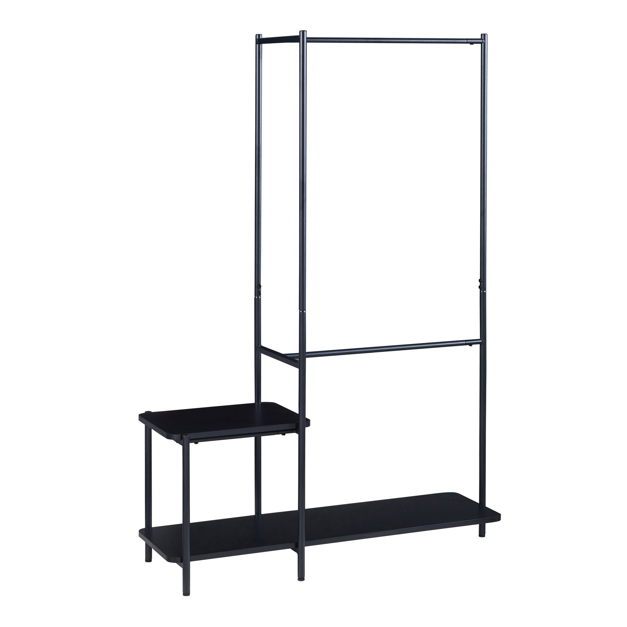 Il design di questo stand è una celebrazione di linee pulite e minimalismo moderno. Le due barre porta abiti sovrapposte creano una disposizione a doppio livello. Sono ideali per appendere giacche, cappotti e vestiti lunghi. La presenza di un piano d'appoggio inferiore, che si estende per diventare il ripiano del tavolino laterale, aggiunge una dimensione pratica. Questo spazio aggiuntivo può essere sfruttato per posizionare accessori, borse o altri oggetti di uso quotidiano, rendendo il mobile un complemento essenziale per qualsiasi ambiente domestico.