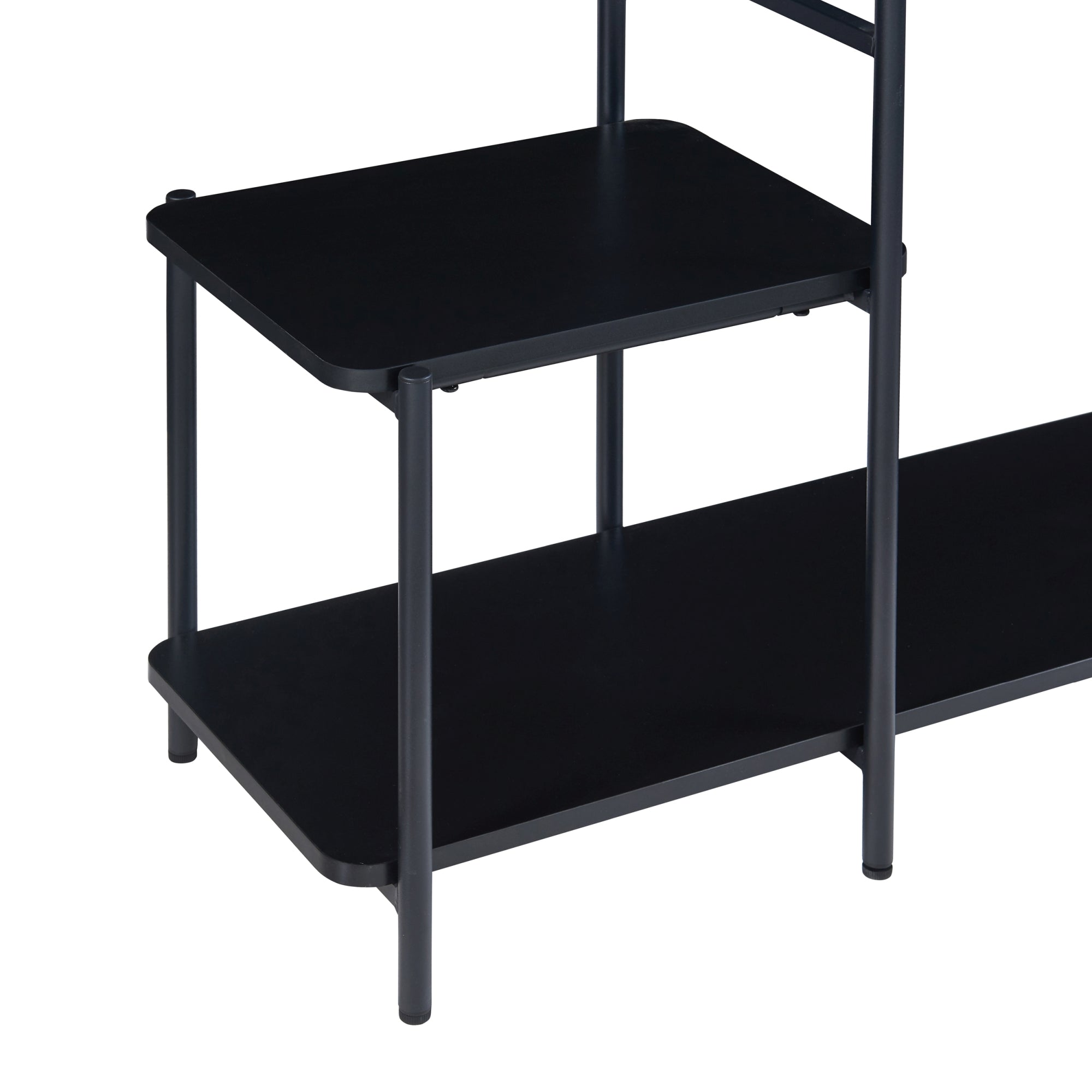 Il telaio dello stand, robusto ed elegante, è realizzato in acciaio, garantendo solidità e durabilità nel tempo. I ripiani fatti in pannelli truciolare, offrono una superficie liscia e resistente. La combinazione di questi materiali dona al mobile una sensazione di qualità e stabilità.