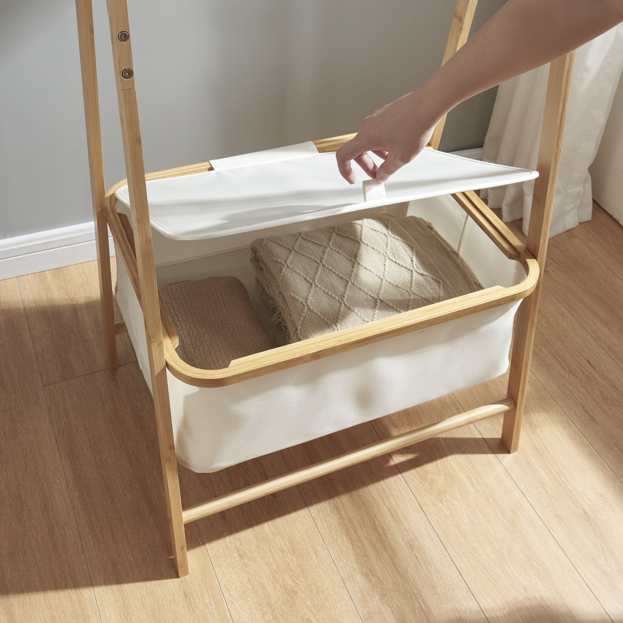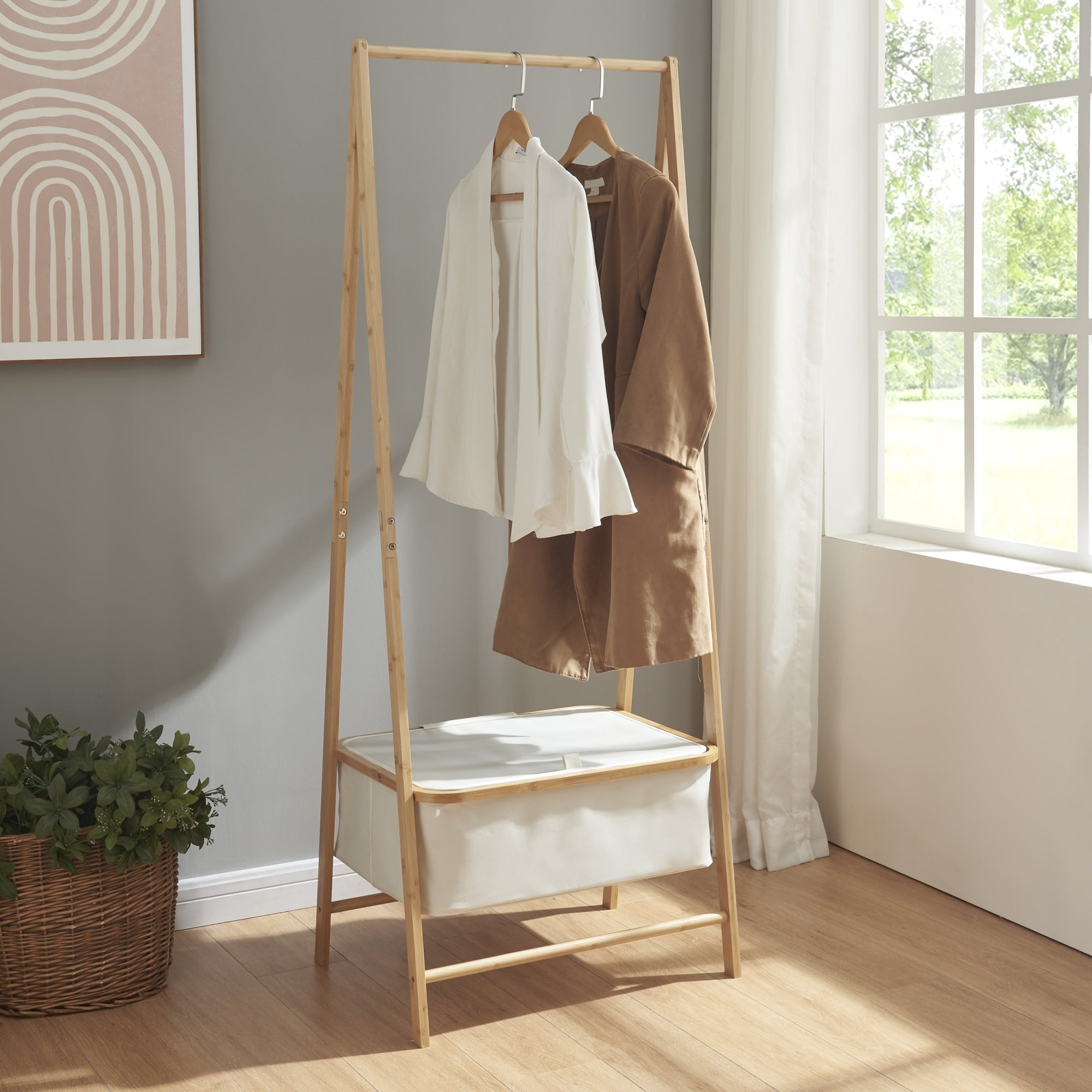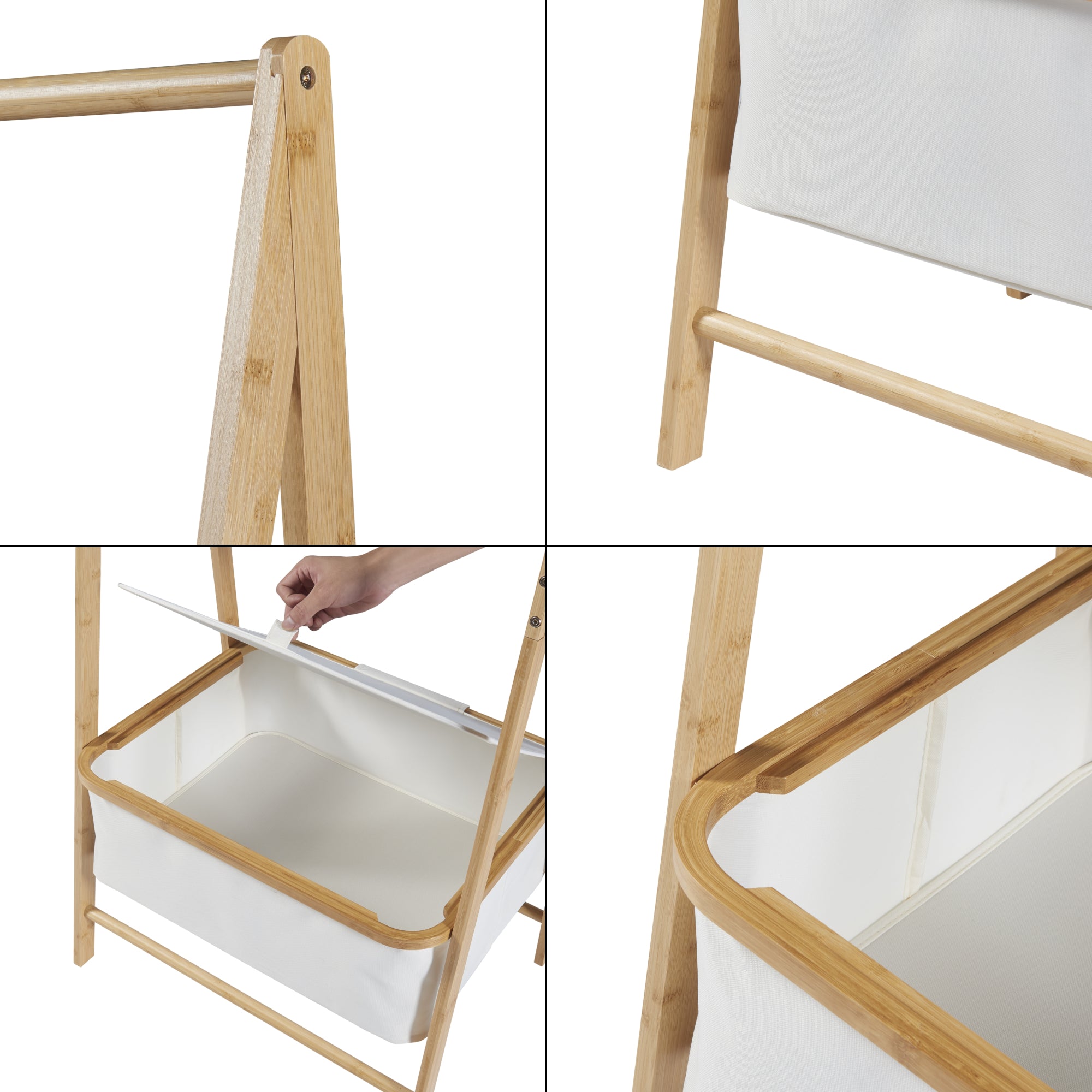 L'utilizzo di questo stand appendiabiti è intuitivo e versatile. La barra porta abiti consente di appendere vestiti di diverse lunghezze senza il rischio di deformazioni. Il contenitore chiudibile posto nella parte inferiore offre spazio per riporre accessori, scarpe o abbigliamento meno utilizzato. Realizzato in tessuto poliestere bianco, il contenitore aggiunge un tocco di leggerezza visiva al design complessivo. La combinazione di bambù e tessuto poliestere conferisce al mobile una resistenza e una durabilità che si sposano armoniosamente con l'estetica complessiva.
